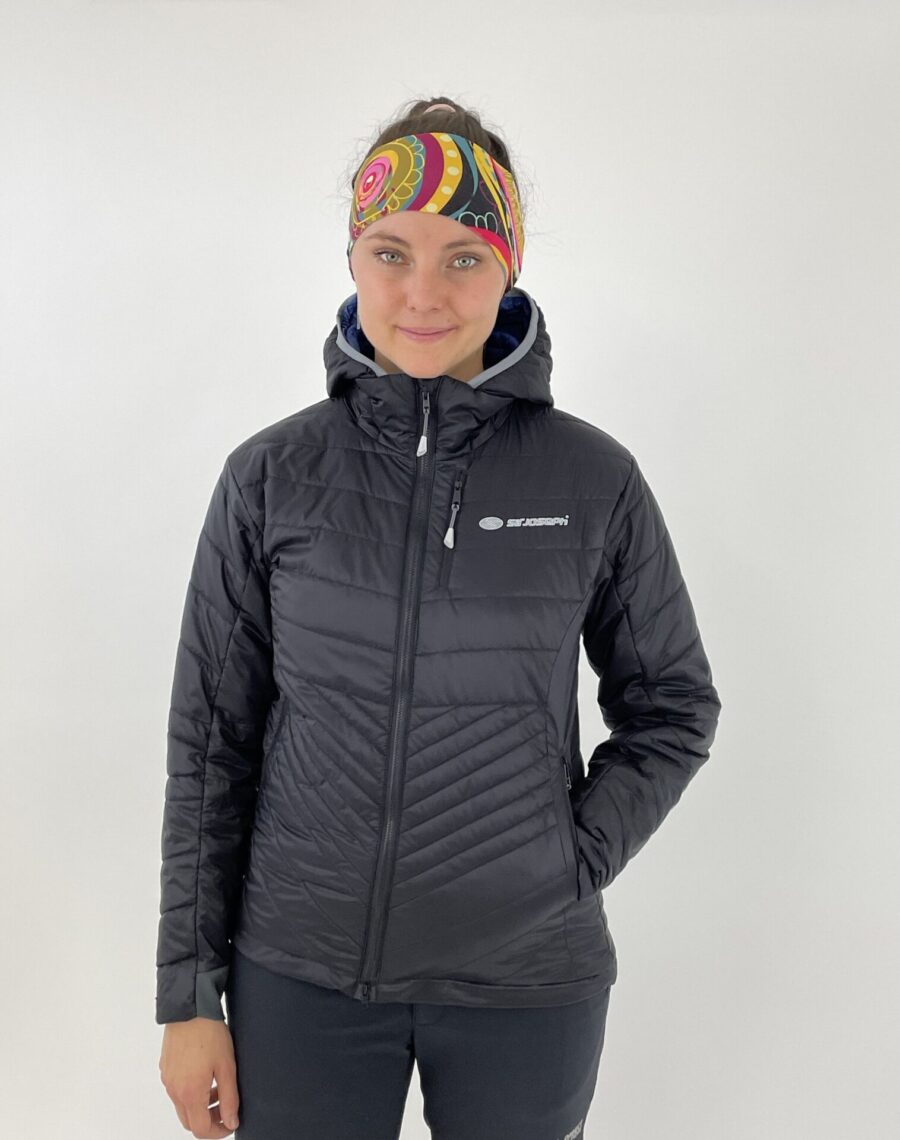 Year-round women’s light and universal insulating jacket with a sporty cut. It won’t blow away, it will withstand light rain and it will keep you warm. Thanks to the abrasion-resistant material, it also works well as a top protective layer, making it an ideal choice for strenuous aerobic outdoor activities in colder weather (ski-alpine tours, climbing, downhill and cross-country skiing).